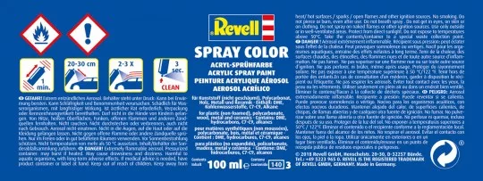 Revell Spray Color zijn acryl-spraykleuren die zeer snel drogen en met een hoge dekkracht en hoge krasvastheid.Wegens de speciale samenstelling kunnen de polycarbonaat carrosserie?n van RC-auto’s ook worden gespoten met Spray Color. Geschikt voor: Kunststof (niet geschuimd), polycarbonaat, hout, metaal en keramiek